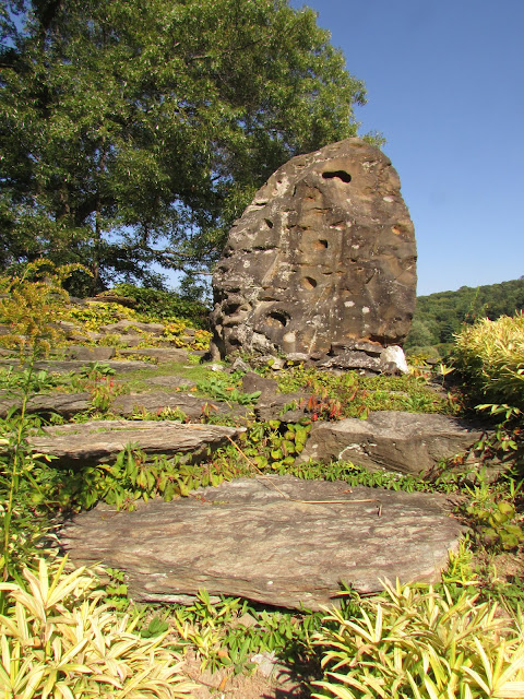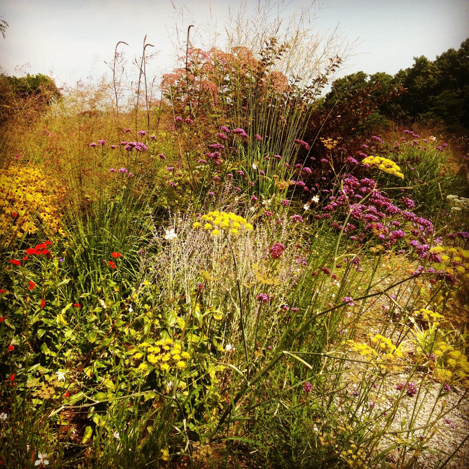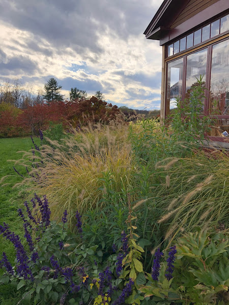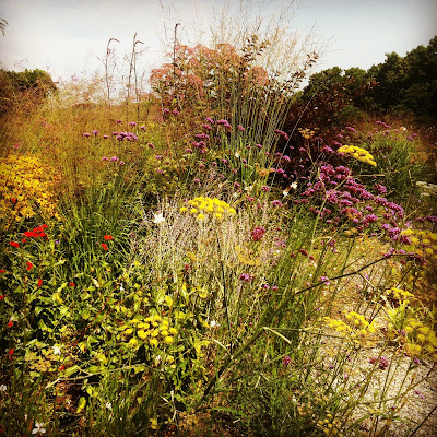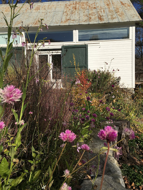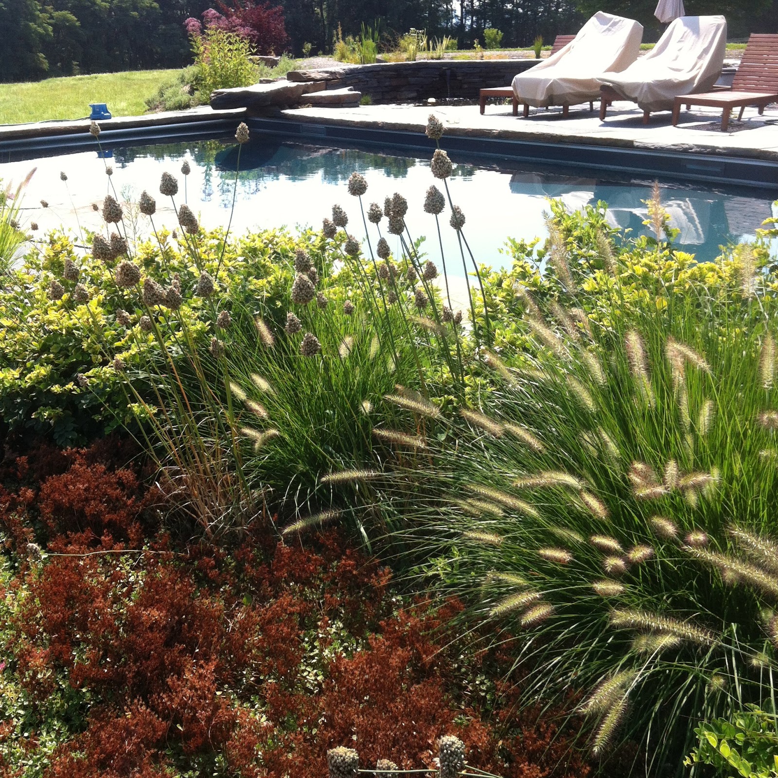 This is a pool garden that Laurie and I planted three years ago using plants pilfered from other parts of the garden, including an Indigofera (possibly 'Rose Carpet?'-hugging the pools edge and doing fantastically against the rocks) and these wonderful Pennisetum alopecuroides seen here in full flower. We planted about 100 drumstick allium (Allium sphaerocephalon) and over the years they have tripled. Last year we cut them back once they went brown, but this year we've let them go to gray and we think they still look good.