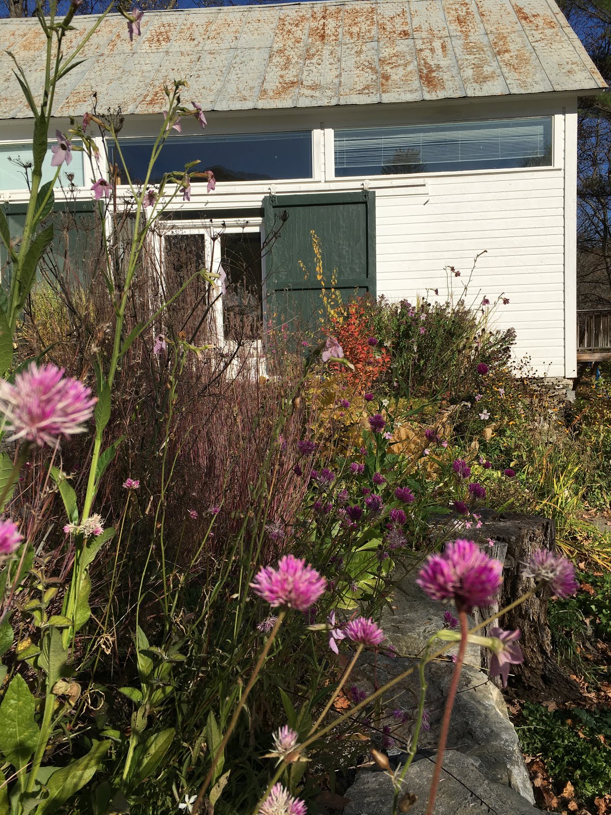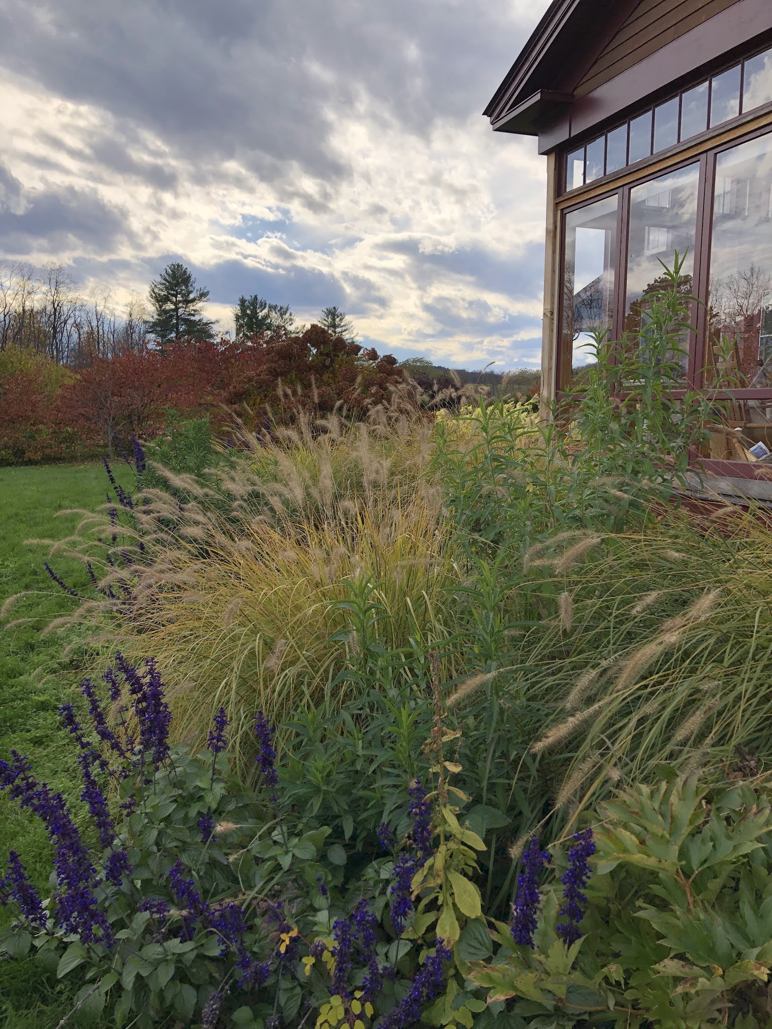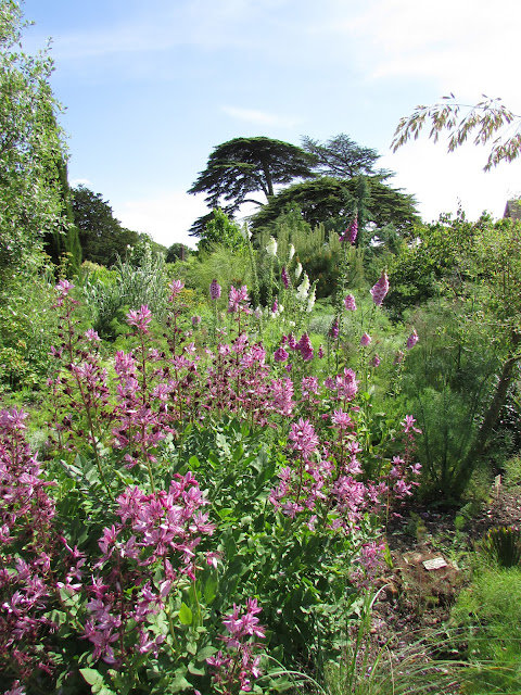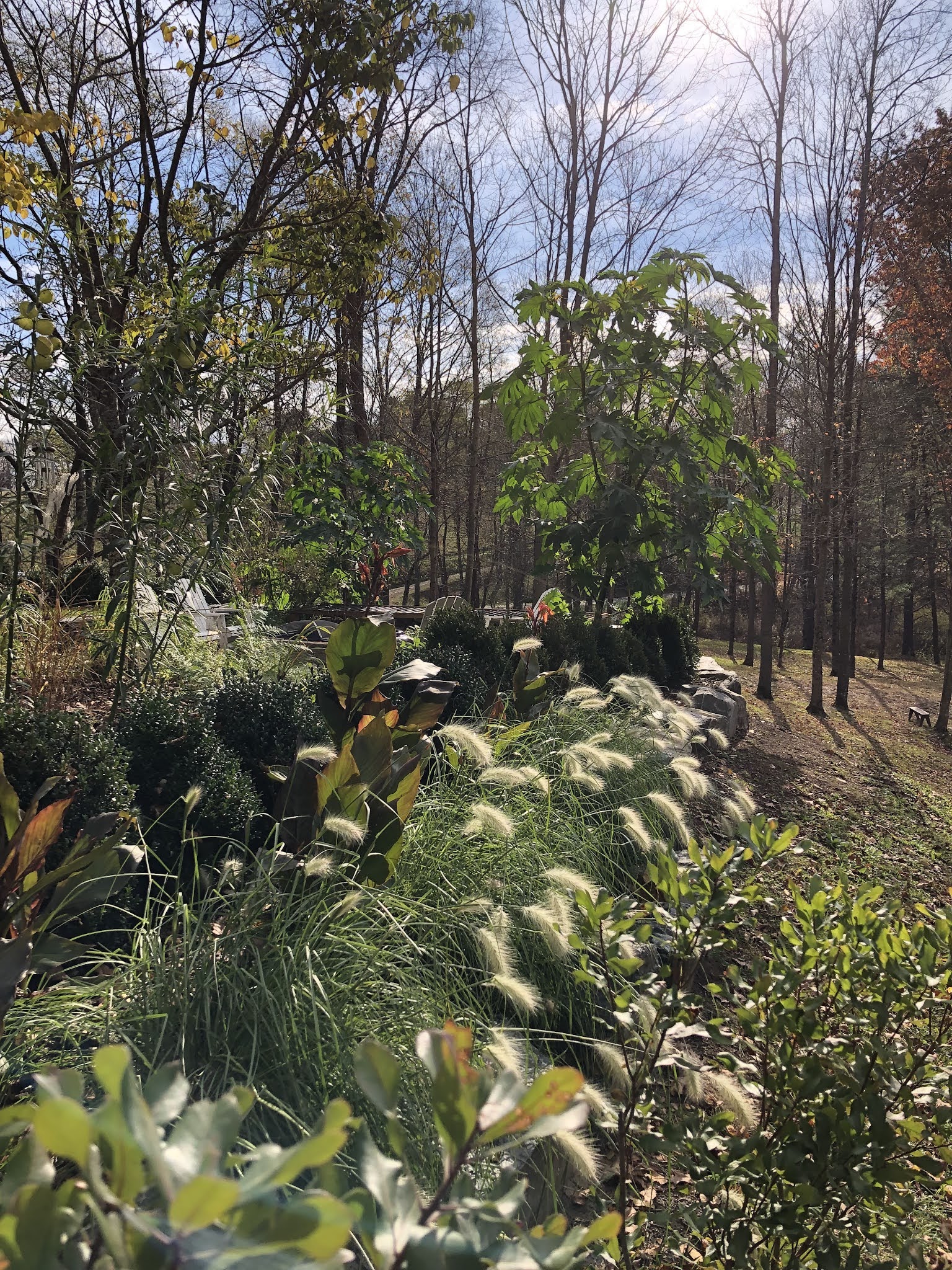 This is a pool garden that Laurie and I planted three years ago using plants pilfered from other parts of the garden, including an Indigofera (possibly 'Rose Carpet?'-hugging the pools edge and doing fantastically against the rocks) and these wonderful Pennisetum alopecuroides seen here in full flower. We planted about 100 drumstick allium (Allium sphaerocephalon) and over the years they have tripled. Last year we cut them back once they went brown, but this year we've let them go to gray and we think they still look good.